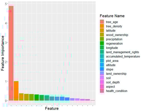 We employed hyperparameter tuning to train the random forest model in order to arrive at the best performing model. We used a 100-repeated fivefold cross-validation resampling setting. Based on the out-of-bag (OOB) estimate [], the mean of squared residuals between the observed and predicted timber volume is 0.000232 m3/tree. As a result, the hyperparameter tuning suggests that the number of optimal randomly sampled variables is 7 with a sampling fraction of 0.289 and a minimum final node size of 3. According to RFE, the most important features are the top ranking 12 attributes shown in Figure 2, while the remaining variables are redundant in timber volume estimation.