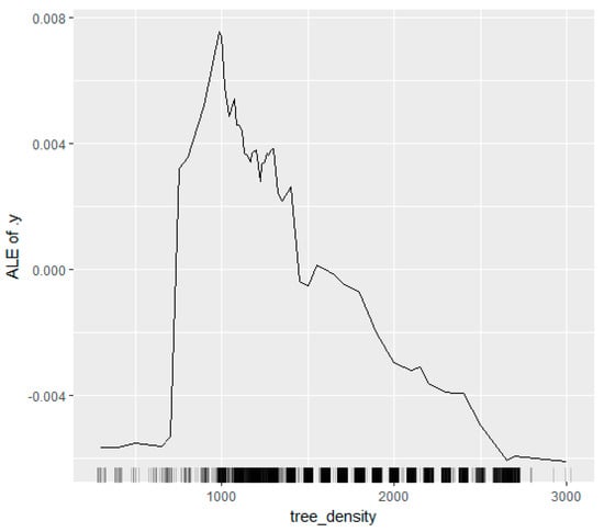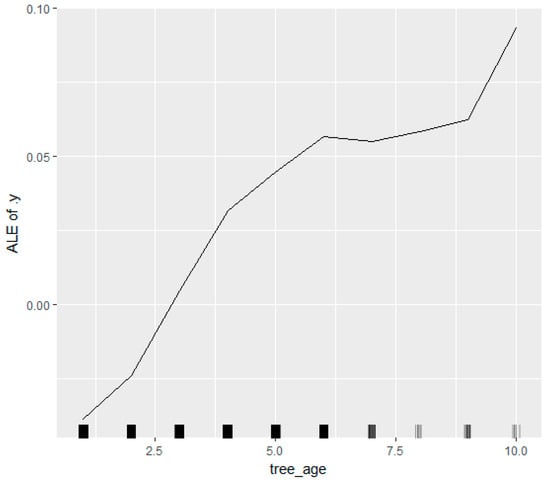ALE plots provide a useful tool for investigating the responses of timber growth to forest factor variations. The individual effect plots demonstrate that timber volume is affected by tree age and stem density. The black blocks on the horizontal axis indicate data abundance while the value on the vertical axis indicates the individual effects of forest factors. From Figure 3, we can see that the average timber volume prediction rises as trees get older before the slope decreases around the age of 6. This implies that the optimal rotation age is around 6 years old. Figure 3 presents an upward trend when the tree age is greater than 8. We believe that these samples are from the experimental fields as most eucalyptus trees are harvested before they reach 6 years of age in Guangxi. Meanwhile, the prediction based on stem density in Figure 4 suggests that the average timber volume rises with increasing density before reaching the turning point of 1000 trees per hectare; after that, higher density leads to a lower predicted volume for a single tree on average.