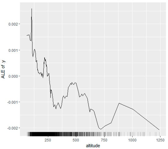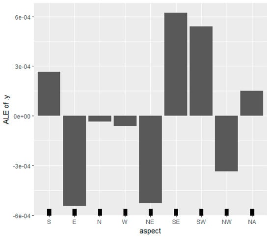 The first-order effect plots in Figure 5 demonstrate timber productivity prediction by altitude. Altitude has a strong effect on timber productivity. Overall, the ALE plot in Figure 5 identifies that timber volume falls with increasing altitude and the tipping point occurs at the altitude of 250 m. In Figure 6, we extract aspects at the centroid of each plantation plot; therefore, the ALE plots are based on categorical features; we observe that tree plots facing to the south or close to south aspects tend to have higher effects on the predicted timber volume. As shown in Figure 6, trees grown on the aspects that face the south (S), southeast (SE), and southwest (SW) share above-average predicted volumes while trees grown on the northeast (NE), northwest (NW), and east share below-average timber volumes.