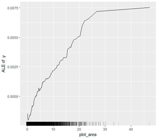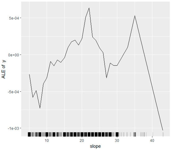The random forest model is inherently capable of handling interaction effects, especially in the case with large forests []; thus, there is no need to include interaction terms in the model. We employ an accumulated local effect (ALE) plot to account for individual feature (factor) effects, as well as interaction effects [,]. The ALE plot describes the average marginal effect on the prediction by varying the values of the factor(s) of interest. ALE function estimates local effects by dividing the factor values into intervals based on quantiles and computes the effect each factor value has within the interval. By aggregating the average effects across all intervals, the ALE plot leads to a more stable estimation compared to traditional techniques []. The ALE plot is integrated in several R packages, such as caret and mlr, and most of them compute the individual (first-order) and interaction (second-order) effect separately [,]. In addition, we also used sp (Version: 1.4-6) and rgdal (Version: 1.5-28) packages for spatial data extraction, randomForest package (Version: 4.7-1) for data analysis and ggplot2 package (Version: 3.3.5) for plotting graphs [,,,].