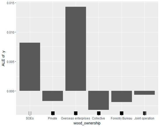 Figure 7 implies that the forest productivity consistently increases with the increase in plot area. During the decentralization of forest land rights, private forest owners tends to have more fragmented forestland, while larger forest management corporations and organization who have stronger capital power usually buy the land management rights from local forest owners, resulting in a larger area of forest plots; from Figure 7, it could be seen that larger forest plots, which are potentially better managed, turned out to have greater productivity. This situation is also confirmed in the tree-ownership plot in Figure 8: based on the histograms, forests managed by state-owned enterprises and overseas companies have relatively larger timber volume while forests owned by private, local communities (collectively owned) generally have lower forest productivity. One thing that needs to be noted here is that the forest plots belonging to forestry bureaus do not necessary performs better than those owned by overseas corporations, and neither do those belonging to joint operated unions (cooperated by different economic organizations).