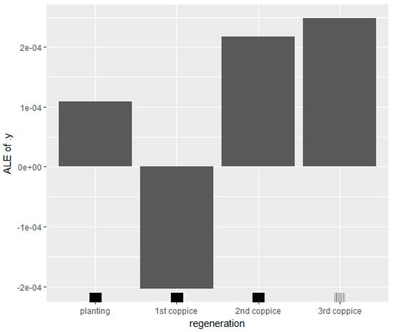 We continue to examine the response of forest productivity to regeneration methods. The results in Figure 10 indicate that the overall direct impact of regeneration methods is trivial as the value of the vertical axis is very close to zero. In contrast, planting forests do not necessarily out-perform forests generated from coppices in terms of timber volume. The first-generation coppice tends to experience lower productivity compared to the second and third coppices.