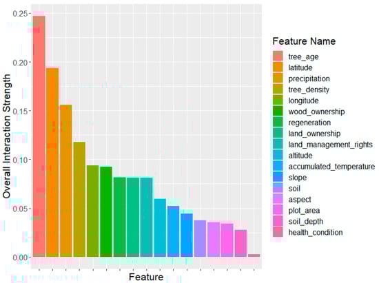 The interaction effects between certain factors could enhance/or decrease growth rate, thus potentially improving /or reducing the total timber output. Though the random forest method is noted for its ability to account for the underlying interaction effects [,,], it would be fruitful to examine the interaction effects explicitly between factors for a better understanding of the ecological suitability of eucalyptus. Figure 11 below presents the joint plot of the interaction effects between one factor and the remaining variables in influencing the timber growth. The interaction effect is the additional change in the prediction after considering the individual (main) effects. It is straightforward to see that the overall interaction strength in Figure 11 represents a close pattern to the feature importance graph in Figure 2. The interaction effect between tree age and the rest of the features is especially strong. Similarly, the overall interaction strength based on the other features with latitude, tree density, precipitation, and accumulated are all in close sequence with those features in Figure 2, making these top-ranking features a high priority for further examinations.