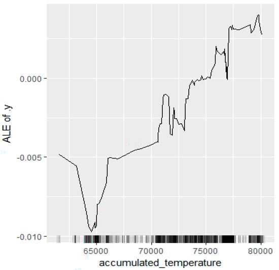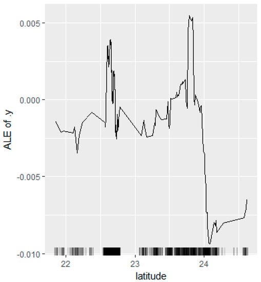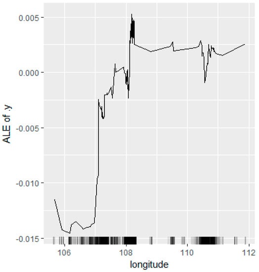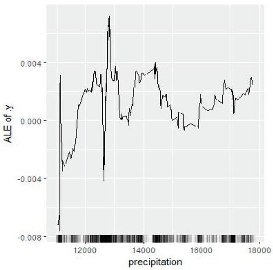 Figure 12 describes the ALE plot of timber growth with respect to latitude. As altitude change caused temperature changes has already been taken into consideration during the data-generation process (with altitude increase 100 m, the average temperature decrease 0.6 °C), we will dig further into the annual precipitation and accumulated temperature as these two factors directly affect forest growth and will have important implications for future land adaptation in climate change contexts. In Figure 12, the average timber volume prediction rises with latitude goes to the northern region. There are productivity peaks in the range of 22.5–24° whereas the line drops sharply after 24°, indicating great decline in productivity in the northern region in cold mountainous areas. Local farmers attribute the low productivity to the relatively low temperature. Meanwhile, the prediction based on longitude (Figure 13) suggests that the eucalyptus plantations located in the middle and east region out-perform those in the west region.