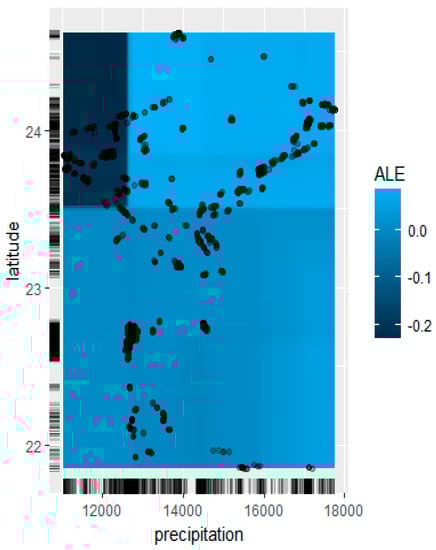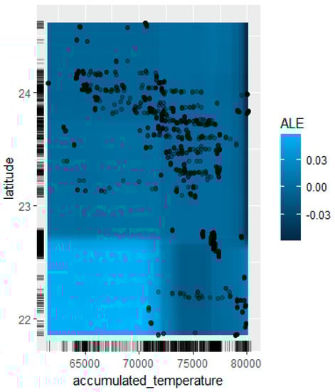 We derived the ALE interaction effect plots for each feature in Figure 11 and drew the related interaction map for features with high rankings. The interaction effects between two factors are the net changes in the prediction that caused by the factor value variation after considering the individual effects. These interaction maps provide intuitive interpretations of interaction effects; due to the large number of maps, we generated the magnitude of the interaction effect and listed them in Table 2. The three highest interaction effects are all between variables and latitude: precipitation and latitude, longitude and latitude, and accumulated temperature and latitude. We report a productivity map associated with latitude and longitude in Section 3.4.