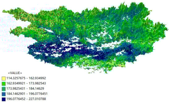 Using the random forest model and rich environmental information from satellite images and the NFI growth data, we predict the eucalyptus productivity for the entire Guangxi province (see Figure 18 below). Topographic information (digital elevation model, DEM) is integrated and proportionally enlarged into a 3D plot for better visualization. The value in Figure 18 denotes the predicted unit land productivity (m3/hectare) for a 5–6-year-old E. urophylla × E. grandis plot. We used the gradient from light yellow to dark blue to represent low to high timber productivity, where the white color stands for non-forested areas. The value in the scale details the corresponding productivity associated with each land, for example, the value of 114 in the scale suggests the lowest timber output for one hectare of land with eucalyptus harvested at the age randomly selected between the age of 5 and 6 years; meanwhile, the largest value of 227 stands for the maximum timber output predicted in the study region.