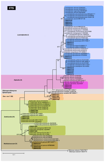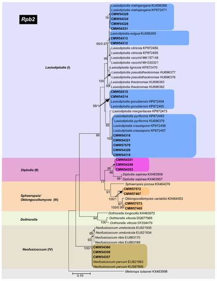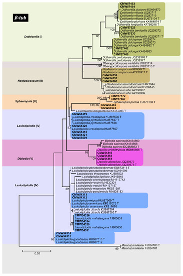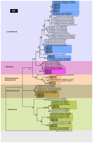 - Yang, T.; Groenewald, J.Z.; Cheewangkoon, R.; Jami, F.; Abdollahzadeh, J.; Lombard, L.; Crous, P.W. Families, genera and species of Botryosphaeriales. Fungal Biol. 2016, 121, 322–346. [Google Scholar] [CrossRef]