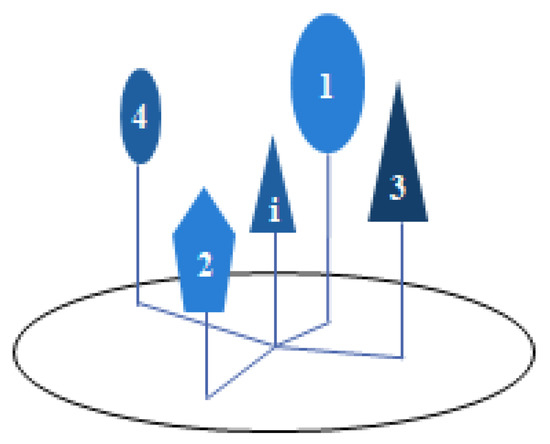 Gadow [52] and Hui et al. [44,53,54] define a structural unit as a group of n nearest neighbors to a reference tree i (Figure 1; cf. Table 1). Within the structural unit, the neighborhood-based structural indices are mingling (Mi), size dominance (Ui) and uniform angle index (Wi). These measures have proven useful for analyzing the spatial structure of forests with mixed species and sizes [38,44,45,50]. Mingling is used to express the aggregation or segregation of different species in multispecies forests and is defined as the proportion of the n nearest, heterospecific neighbors when compared with the species of reference tree i [46,52,55]. Size differentiation gives proportion of the n nearest neighbors that have a smaller size (in terms of, for example, dbh, height, crown width, etc.) than reference tree i [44,56]. The uniform angle index (Wi) describes the spatial pattern of tree locations in the neighborhood of reference tree i [44,55,56,57] and is defined as the proportion of the angle α which is less than the standard angle α0 (72°). The angle α refers to the smaller of the two angles formed by the reference tree and the nearest two adjacent trees [44,53,56]. The values of the three spatial structure indices take the same discrete values, e.g., 0.0, 0.25, 0.5, 0.75 and 1.0 for .