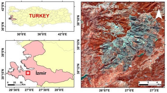 The fire event considered in this study occurred on 18 August 2019 in the district of İzmir metropolitan city (Figure 1). The region where the forest fire was located has a Mediterranean climate. The forest is dominated by coniferous Turkish red pine (Pinus brutia Ten.) and maquis vegetation cover []. The elevation ranges from 140 to 975 m. Approximately 5000 ha was affected by the fire [,].