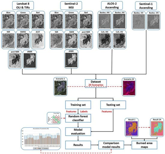 In this study, a multi-sensor approach was proposed to determine the post-fire BA detection. For the analysis, visible, near infrared (NIR), and thermal bands of optical and thermal sensors and multi-frequency SAR data were used (Table 1). The optical satellites, Sentinel-2 and Landsat-8, of pre- and post-fire images were acquired from the archives of ESA (https://scihub.copernicus.eu/) (accessed on 1 September 2021) and NASA (https://earthexplorer.usgs.gov/) (accessed on 1 September 2021). Similarly, pre- and post-fire images of C-band Sentinel-1(https://scihub.copernicus.eu/) (accessed on 1 September 2021)and L-band ALOS-2 data were used as SAR images. As the time difference between pre- and post-event acquisitions of ALOS-2 data includes a long period, the same acquisition period was also preferred for the other datasets. Different features from optical, thermal, and SAR data were obtained and their contribution to the BA extraction was tested with the RF classification method. A generalized workflow of the study is presented in Figure 2.