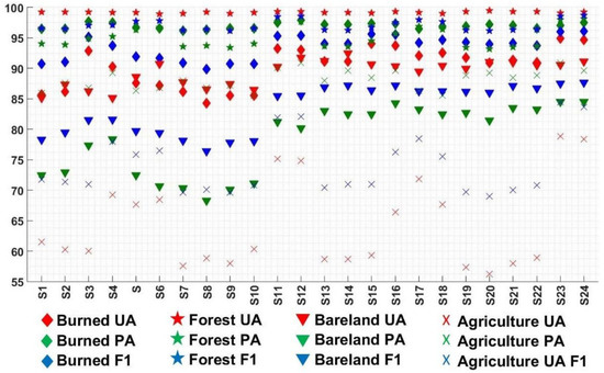 Similar to Sentinel-2, the dNBR improved the accuracy better than L-8 NBR2020 when combined with Landsat-8. Both dB values of ALOS-2 and Sentinel-1 could not contribute to the S13. However, similar to Sentinel-2, Landsat-8 combined coherence improved the results. The combination of all data (S24) provided an increase of 3.2% in the OA and 5.54% in the Kappa values. Including dLST and coherence of ALOS-2, the results slightly improved the UA from 92.85% to 93.23% and decreased the PA from 97.64% to 97.49%. Landsat-8 increased the UA of BA by 3.8%. S24 provided the highest PA and F1 among all scenarios (Figure 5).