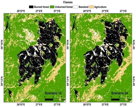 In general, the results of Sentinel-2 (S1 to S12) and L-8 (S13 to S24) showed that Landsat-8 provided slightly higher accuracies than Sentinel-2. Considering the class of burned forest, the accuracies were close to each other, which is similar to the spatial distribution pattern of burned areas in two products (S12 and S24). The results showed that the scenario combined with Sentinel-2 (S12) detected a slightly higher BA (5813 ha) than the scenario combined with Landsat-8 (S24) (5742 ha). The BA of Turkish Red pine was about 98%, whereas 10% was degraded forest in both results. The rest is composed of agriculture (~55 ha in S12 and ~50 ha in S24) and maquis (~59 ha in S12 and ~60 ha in S24). Ngadze et al. [] compared RF classified Sentinel-2 and Landsat-8 images over two areas and showed that Sentinel-2 had higher accuracies on one site while Landsat-8 accuracy was higher on the other site. They report that the reason for their result may be due to the acquisition periods of the satellite images. In our case, there was also a time difference between the two satellite image acquisitions. Another reason might also be due to the up-sampling of Sentinel-2 images to Landsat-8 resolution. When comparing bands, the thermal band added scenarios (S4 and S16) had higher contributions than scenarios with a combination of NIR and SWIR bands (S1 and S13), as seen in both Sentinel-2 and Landsat-8 datasets.