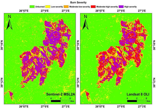 In this study, to determine the burn severity of the selected region, NBR and dNBR were calculated by using pre- and post-fire Landsat-8 OLI and Sentinel-2 MS data (Table 2). BA severity can be easily classified by the dNBR index. The dNBR is obtained by using the bi-temporal difference of the preprocessed NBR images [].