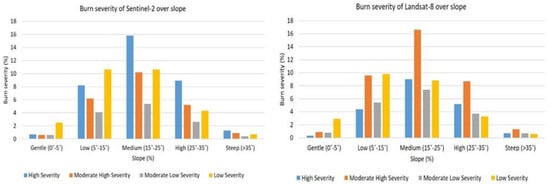 The burn severity analysis using dNBR showed that Sentinel-2 resulted in a higher level of severity compared to the Landsat-8 data. The differences between the two severity maps might be due to the differences in image acquisition periods and the spatial resolutions []. The burn severity and its distribution on different slope levels showed that Sentinel-2 and Landsat-8 provided similar trends: 42% and 41.8% of burn severity were located over the medium slope using Sentinel-2 and Landsat-8, respectively.