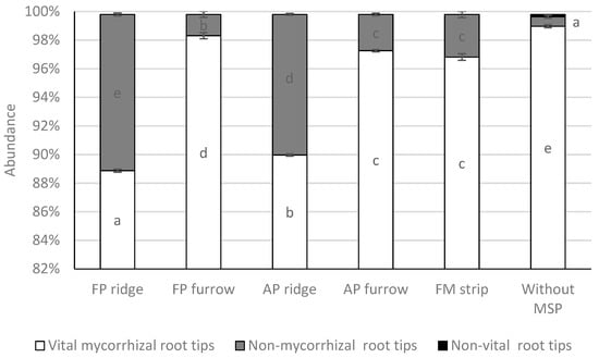 Abundance of vital mycorrhizal, non-mycorrhizal, and non-vital root tips (%) (mean and standard errors bars) of 1-year-old Scots pine seedlings in relation to MSP methods: furrows and ridges made by a forest plough (FP) or an active plough (AP), strips made by a forest mill (FM), and without MSP (the control). Within each classification, different letters indicate significant differences obtained using the Tukey’s linear contrast based on the GLM model: p ≤ 0.05).