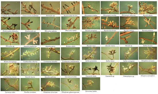 Washed root systems were lined on a Petri dish with distilled water and analysed (at 10–40× magnification) using a Delta IPOS-808 dissecting microscope coupled with a camera. Mycorrhizal root-tips were identified by reference to the presence (also colour, shape and surface texture) of the mycelial mantle, as well as the presence of extramatrical mycelium and rhizomorphs. On the basis of the above features and illustrated scientific studies [39], vital mycorrhizal root-tips (VM) were counted and attributed to corresponding morphotypes. Also counted were non-mycorrhizal (NM) root-tips—lacking the characteristics of ectomycorrhizae and having root hairs, and non-vital (NV) root-tips—heavily wrinkled and dead. Each mycorrhizal morphotype was photographed. Three representative mycorrhizal root-tips of each observed morphotype were placed in Eppendorf tubes filled with 70% ethanol, labelled, and stored at −20 °C until further molecular analyses were commenced with. A total of 295 morphotypes were collected. The final grouping and assignment of morphotypes classified previously on the basis of the morphological characteristics of mycorrhizal root-tips was achieved through the analysis of fungal rDNA.