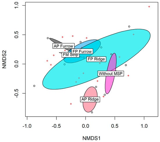 Differences in soil grain-size at different microsites were only noted in relation to the ridges generated by AP (r2). In comparison with that in the non-MSP treatment, the soil in this case contained significantly more silt (p = 0.0365) and significantly less sand (p ˂ 0.0001). Equally, the microsites generated by MSP or with no MSP did not differ in regard to C/N ratio, content of P2O5 and clay, or actual moisture (Table 1).
