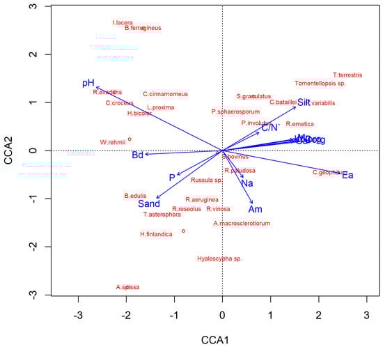 CCA graphs for mycorrhizal fungal communities underlined by soil parameters in relation to Scots pine seedlings growing on a clearcut. Ea—exchangeable acidity, Bd—bulk density, Am—actual moisture, overlapping arrows: N, C, Ca, K, Mg, Clay.