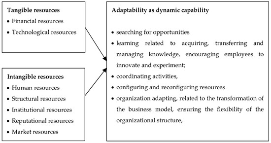 One of the important features of dynamic capabilities is organizational change management [25,37,39,40,41,42]. Taking this assumption into consideration, our research procedure posits that shaping dynamic capabilities includes five stages [29]: (1) searching for opportunities related to analyzing trends and environmental phenomena, creating new ideas and identifying the need for changes; (2) learning, related to acquiring knowledge, transferring, allocating and storing knowledge within an organization, managing intellectual property, encouraging employees to innovate and experiment; (3) coordinating activities related to creating a vision, integrating supply chain processes, managing strategic alliances, building employee involvement, creating consistent decision-making rules, integrating and coordinating business processes; (4) configuring and reconfiguring, related to the creation, acquisition, and integration of resources and skills; creating innovation, divesting unnecessary resources and skills, implementing new technologies; (5) organization adapting, related to the transformation of the business model, management of the boundaries of the organization, ensuring a dynamic process of strategic management, improvement of the organization, adaptation and implementation of the best management practices, ensuring the flexibility of the organizational structure, managing the identity of the organization. The resources that shape dynamic capabilities are presented in Figure 1.