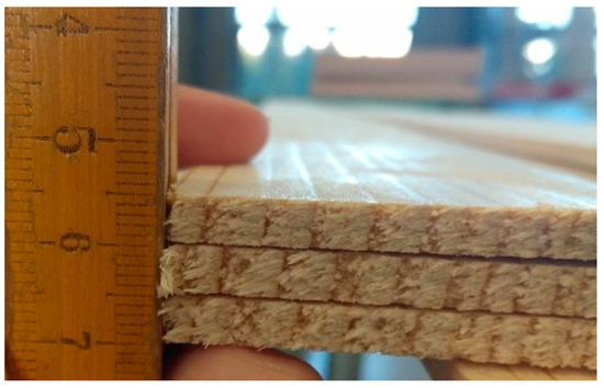 The adhesive was applied in a thin and delicate layer at 200 g/m2 on the specimen’s surface with the help of a toothed spatula. A total of three glued layers were formed in each specimen. Then, the specimens were cold-pressed in an industrial press GS 6/90 (SCM GROUP S.p.A., Italy) under 1 MPa at an ideal temperature of 20 °C. The pressing time was 40 min for EPI and 120 min for PUR adhesives, respectively (Figure 1). After the completion of the cold-pressing, the specimens with EPI adhesives were kept at room temperature for another seven days for curing. Afterward, the glued specimens were cut to a required bending test sample with dimensions 15 mm × 20 mm × 300 mm) (Figure 2).