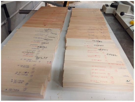 Two European softwood planks, namely Norway spruce (Picea abies (L.) H. Karst.) and European larch planks (Larix decidua Mill.), were selected for this research. The planks were collected from a commercial supplier. The planks were then kiln dried. Subsequently, numerous defect-free lamellae with dimensions of 5 mm × 45 mm × 1500 mm were sawn (Figure 1). All lamellae were air-conditioned in the humidity chamber HCP 108 (Memmert, Germany) under conditions (relative air humidity of 65% ± 5% and temperature of 20 °C ± 2 °C) to achieve equilibrium moisture content of 12%.