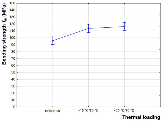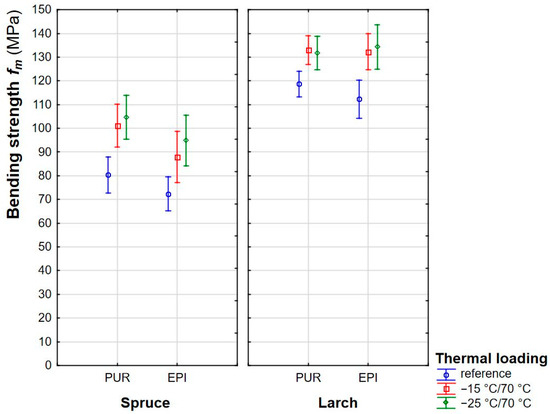 In order to determine a generalized effect of thermal loading on the bending strength of wood, the data from both types of wood were combined and are shown in Figure 4. Thermal loading (altering temperature) could not cause any detrimental impact on the bending strength. Rather, it could positively affect bending strength in both species, though the degree of the improved bending properties varied depending on the wood species. In spruce wood, the increase in the bending parameter due to thermal loading ranged between 22% and 31% from the reference values, and maximum increased value was obtained in EPI glued specimens subjected to −15 °C/70 °C loading temperature.