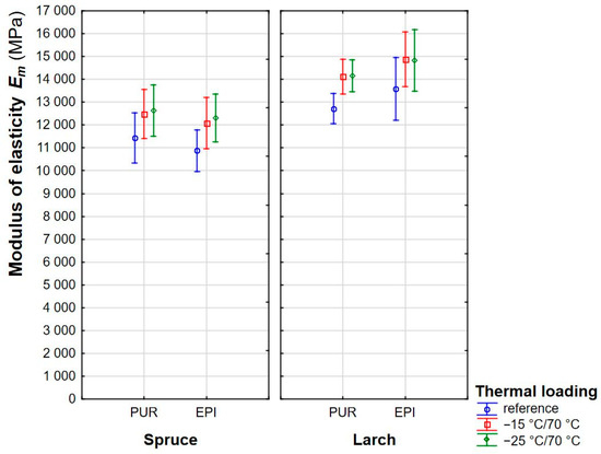 From the graphs presented, it can be stated briefly that glued larch wood specimens have a moderately higher modulus of elasticity compared to spruce. Nevertheless, there is a slight increase in the elastic modulus at both thermal loadings (between 9% and 13%), and a marginal nonsignificant difference between two different thermal loads. This result is consistent with studies by previous researchers who found an increase in the elastic modulus due to a decrease in temperature [11,13,47,51].