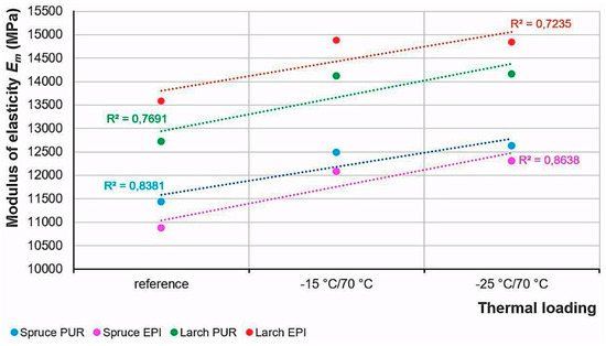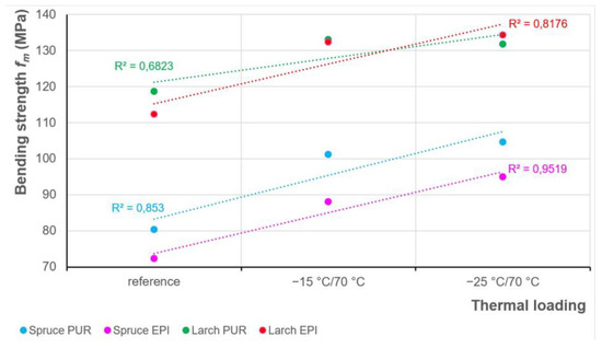 However, when a regression model is used to determine the dependence of bending strength and modulus of elasticity on thermal loading for wood glued with a specific adhesive (PUR or EPI) and made of a specific wood species (spruce or larch), an increasing trend of both bending characteristics and a coefficient of determination can be seen (Figure 8 and Figure 9).