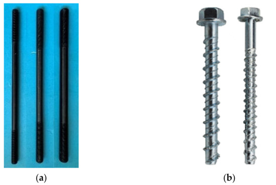 As shown in Figure 4, tension tests were conducted at a loading rate of 0.2 mm/min to determine the yield strength of the bolts in accordance with ASTM A 370 [34] and the yield strength of the screws in accordance with ASTM F 606 [35].