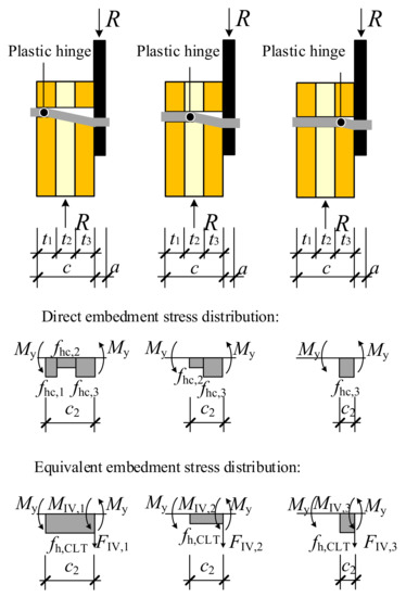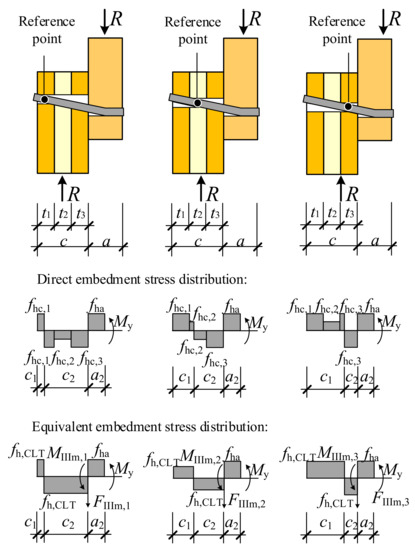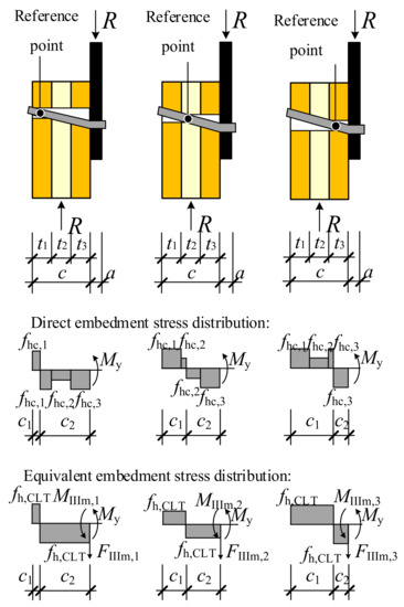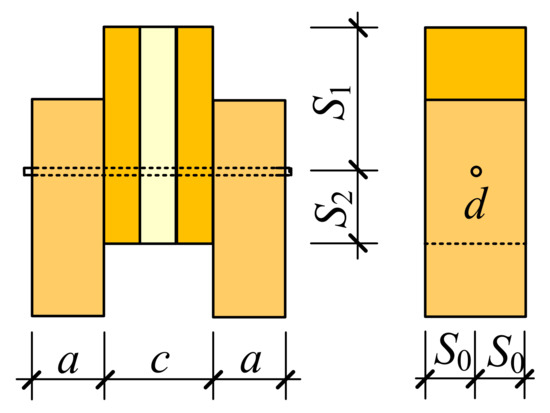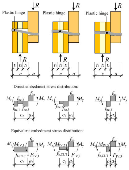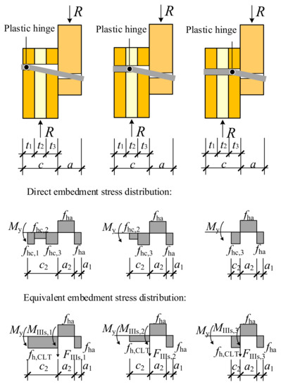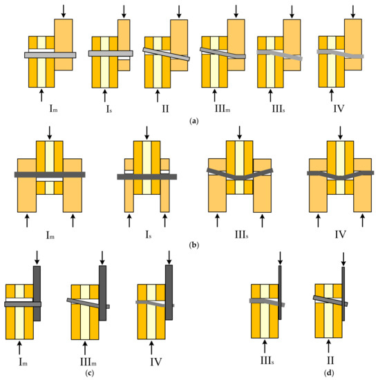 According to the EYM, a dowel-type connection fails when the embedment stress reaches the strength of wood or when the dowel yields, provided that sufficient spacing is guaranteed [38]. The yield modes of dowel-type connections in CLT, which are also referred to as the failure modes, are shown in Figure 9.