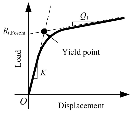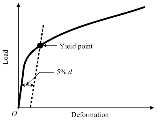 The 5%d offset method may not estimate the yield load of the screwed connections correctly where the plasticity is not well developed. Treating the wood as nonlinear foundation of the nail, Foschi [41] proposed a three-parameter exponential function model describing the behavior of laterally loaded nailed connections, which are similar to the screwed connections in terms of the strength and the geometrical dimension of the fasteners. The yield load is defined as the intersection of the initial elastic line of the load–slip curve and the asymptote of the curve as the slip tends to the infinity, as shown in Figure 25 [42].