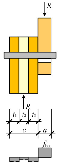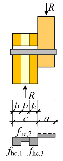 As shown in Figure 13, the bolt remains straight in the CLT member, and a plastic hinge is formed in the side member. Following the principle of the equivalence, the lateral resistance RIIIm,j for Yield Mode IIIm with the reference point being located in the jth layer lamination can be derived as
