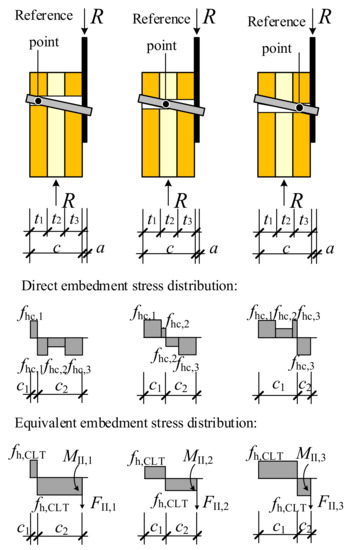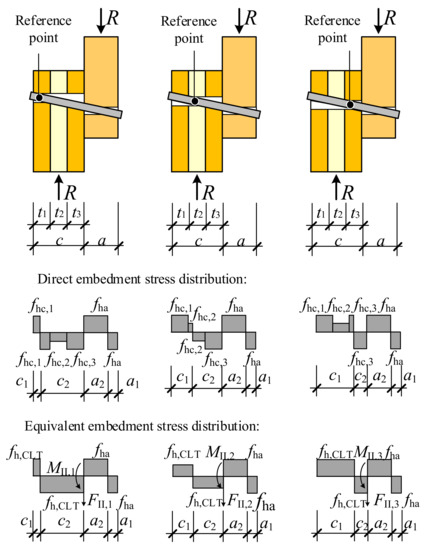 As shown in Figure 12, the bolt remains straight in both members. There is a reversal point of the embedment stress distribution in the CLT member, which is considered the reference point of the embedment stress distribution in this study. The reference point can be located in any of the three layers of lamination, which defines different stress distribution in CLT. The lateral resistance could be derived using the direct embedment stress distribution, yet the expressions so derived would be very complex to use. To simplify the situation, a method to calculate the lateral resistance via the equivalent embedment stress distribution is proposed in this study. The equivalent embedment stress distribution for Yield Mode II is shown in Figure 12, where different embedment stress in different layers is represented by the uniformly distributed stress, equaling the embedment strength of the jth layer, in which the reference point is located. The equivalence is realized by introducing an additional shear FII,j and an additional bending moment MII,j to the cross-section of bolt at the interface between the connected members, so that the shear and the bending moment at the interface remain the same before and after making the equivalence. The embedment strength of the lamination containing the reference point fhc,j is taken as the equivalent embedment strength fh,CLT of the CLT. The additional shear FII,j and bending moment MII,j are derived, respectively, as follows.