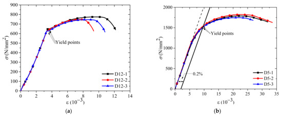 High-strength bolts of Grade 8.8 [30] and self-tapping screws were used in this study. Bolts with the effective diameter of 10.6 mm, 12.6 mm and 14.6 mm, corresponding to the thread diameter of 12.0 mm, 14.0 mm and 16.0 mm, respectively, were used in tests of the bolted connections. To determine the yield strength of the bolts, the bolt specimens with a length of 300 mm were tested. The bolt specimens as shown in Figure 1a were divided into 3 groups according to the thread diameter. Screws with the effective diameter of 5.0 mm and 10.0 mm, corresponding to the thread diameter of 7.5 mm and 12.0 mm, respectively, were used in tests of the screwed connections. To determine the yield strength of the screws, the screw specimens with a length of 100 mm were tested. The screw specimens as shown in Figure 1b were divided into 2 groups according to the effective diameter. The details of the bolt specimens and screw specimens are listed in Table 1.