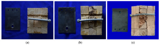 Typical yield mode of bolted timber-to-CLT connection specimens (d = 12 mm): (a) Specimen B10-1: Yield Mode Is; (b) Specimen B13-1: Yield Mode IIIs; and (c) Specimen B7-1: Yield Mode IV.