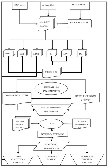 Based on the two mapping products of the two time slots, a transition matrix was constructed in order to quantify the change and identify its pattern. Furthermore, two landscape diversity indices were calculated, the Shannon’s Diversity and Evenness indices, in order to see if the observed changes had resulted in increased homogeneity or heterogeneity. The calculation was performed using the Patch Analyst extension for ArcMap [53]. Finally, a multitemporal spectral profile of the main transitions was constructed based on the NDVI values. The flowchart adopted for this study is shown in Figure 2.