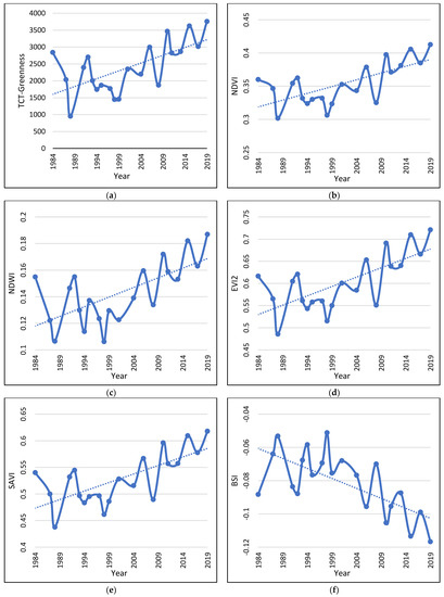 The tested vegetation indices, on the other hand, all show statistically significant relationships with time and statistically significant positive or negative trends during the study period (Table 5; Figure 3b–f). The results clearly indicate that, during the study period, the vegetation cover of the study area increased significantly.