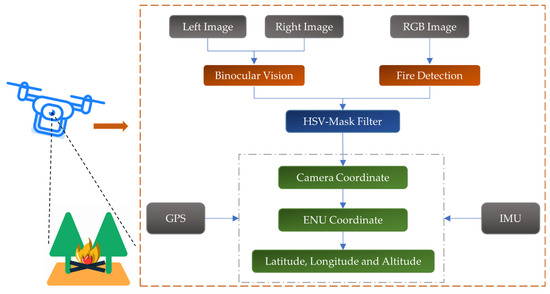 - We propose a spatial localization method based on a multi-sensor fusion, including an RGB camera, binocular cameras, GPS module, and IMU module. The fire area’s longitude, latitude, and altitude can be acquired through space coordinate transformation.