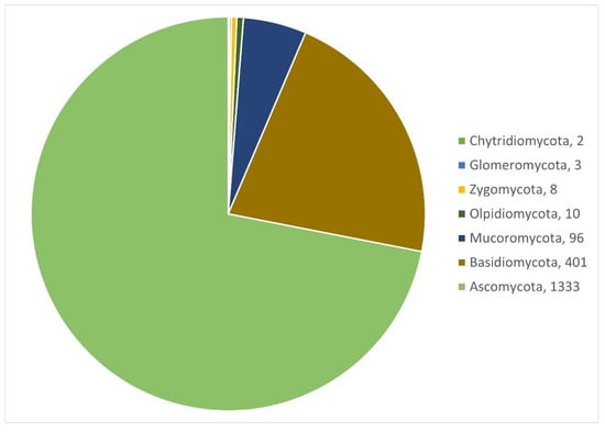 Fungal richness, number and proportional distribution of the 1853 fungal OTUs representing all the detected taxonomic phyla.