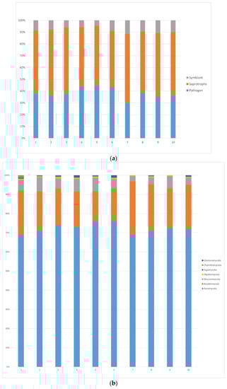 Considering the composition of the different trophic groups of the fungal communities, it was observed that the greater abundance of symbiont fungi was due exclusively to the high presence of truffle in these samples (3, 5 and 6), given that these plots did not have a higher richness of other mycorrhizal species (Figure 2a,c). In a recent study, Oliach et al. [5] found no association between the abundance of T. melanosporum and the presence of other ectomycorrhizal fungi. Furthermore, in those sites with a higher abundance of T. melanosporum, the abundance of pathogenic organisms was lower. This result also agreed with that found by Oliach et al. [5], who reported a negative correlation between the abundance of T. melanosporum and the abundance of putative plant pathogens.
