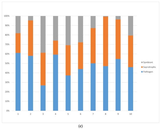 (a). Fungi ecological groups’ richness by sample. (b) Fungi phylum richness by sample. (c) Ecological groups’ abundance by sample.