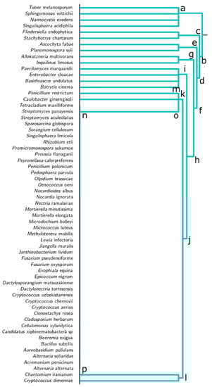 The dendrogram can be read as showing which species cluster together at increasing similarity thresholds: at the lowest level (left-hand side of Figure 4), only the most similar (i.e., most strongly co-occurring) species were clustered. The similarity threshold decreases rightward. Therefore, reading from the right we encounter the most coarse-grained divisions first. So, Figure 4 shows a division between two main branches (a) and (b), where each letter name refers to the sub-tree rooted at that point. The first subtree (a) was composed of T. melanosporum and the bacterial species Sphingomonas wittichii Yabuuchi, Nannocystis exedens Reichenbach. and Singulisphaera acidiphila Kulichevskaya. The other subtree (b) was composed of species from Flindersiella endophytica Kaewkla & Franco (bacteria species) to Cryptococcus dimennae Fell & Phaff (fungal species). In the subtrees under subtree (b), bacterial species were mixed together with fungal species. In the subtrees closer to T. melanosporum, there were more bacterial species than fungal species, such as in the subtree (g), where there was no presence of fungal species. However, the more distant black truffle was, the more abundant fungal species were, such as in subtree (i), composed of three fungal species and one bacterial species, and the subtree (p), with 26 fungi species and 18 bacterial species.
