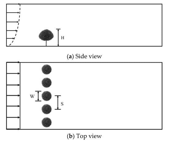 A number of previous related studies have focused on the areas of forestry and meteorology. Using field observations, the major focus was to examine the global wind flow characteristics of trees in forests. Many originally 3-D wind-flow problems were simplified into 2-D or even 1-D cases. Finnigan [2] pointed out that surface wind flow regions could be divided into a canopy and a surface sublayer. Based on the results of field observations, Raupach et al. [3] found that the turbulent flow pattern within the canopy sublayer was similar to that of a mixing-layer flow. By performing wind tunnel experiments, Raupach et al. [4] proposed a description of the wind speed profile in forest territories. Mihailovic et al. [5] also suggested similar profiles. According to the results of wind tunnel measurements, Massman [6] used the concept of leaf area index (LAI). Certain discussions were made regarding its influences, such as the wind speed profiles, surface shear velocities, and roughness heights. Moreover, Novak et al. [7] concluded that a change in the spatial density of forest trees could affect the characteristics of local mean and turbulent flows, which are mainly dominated by large-scale turbulence eddies. In a wind tunnel study of wind flows past a single layer and a double layer of plants, Boldes et al. [8] found that mixing flows occurred in the wake region and produced bleed flows due to the effects of large-scale eddies. Further experimental works were performed by Flesch and Wilson [9,10] to investigate the extent of wind speed reduction downstream of tree groups and the resulting protected area.
