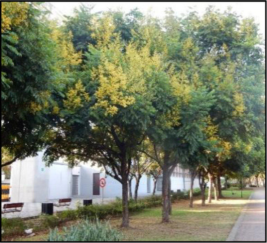 As Koelreuteria henryi is one of the most popular native landscape trees adopted for row trees planting in Taiwan (see Figure 3), it was selected as the target tree species in the present study. Accordingly, a number of images of Koelreuteria henryi were collected through field observations to estimate their shapes and crown densities, according to the evaluation procedures suggested by Schomaker et al. [20]. The final tree shape and related properties, such as the crown density, were the averaged outcomes of the observed results from different observers.