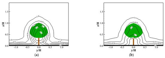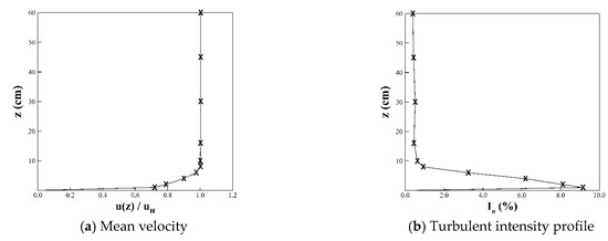 Figure 5 shows the mean velocity and turbulent intensity (Iu) profiles of the oncoming flow in the wind tunnel experiments (uH = 8.10 m/s). A TFI Cobra probe was set downstream of the tree to measure the velocity profiles at 3 H and 4.5 H, respectively, downstream. A Cobra probe is a multi-hole pressure probe that provides dynamic three-component real-time velocity measurements. It is capable of a linear frequency-response from 0 Hz to more than 2 kHz, and is available in various ranges of use, between 2 m/s and 100 m/s. In all the velocity measurements, the sampling rate was 1000 Hz and the measurement period was 64 s. Figure 6 illustrates the measured downstream velocity profiles.