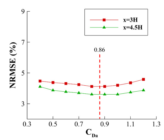 Parallel flow simulations were conducted using a number of tentative selections of the crown factors (CDa). By comparing the predicted downstream velocity profiles with the measured ones, the CDa value, leading to the best agreement, was then determined. Figure 7 shows the variations of the resulting normal root-mean-square error (NRMSE), or the average relative error, in relation to the change in CDa value. Accordingly, the best CDa value was obtained at 0.86. The resulting relative errors of the downstream flow predictions were less than 4.2%. Figure 8 shows the corresponding predicted downstream velocity profiles.