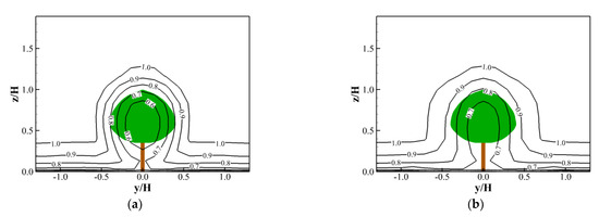 Since Koelreuteria henryi is one of the most popular landscape trees adopted for row trees in Taiwan, it was selected as the example tree in the present study. By conducting additional analyses of the flow results, effects due to the changes in tree heights and tree spaces were extensively examined. The achieved quantitative information can be referenced in other cases of row trees with similar crown shapes and crown properties. There have been typical discussions and proposals [21,22,23,24,25,26] made available regarding the evaluations of the extent of pedestrian comfort under the action of wind. Accordingly, the quantitative information of the resulting spatial distributions of the pedestrian-level wind speeds at different tree heights and tree spaces (Figure 10, Figure 11, Figure 12 and Figure 13), as well as the corresponding stream-wise speed variations (Figure 14), can be readily used to proceed with further shelter effect assessments and pedestrian comfort evaluations.