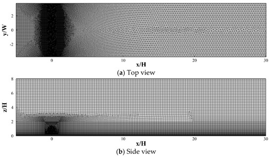 Figure 9 illustrates the computation domain in a typical case were the tree height (H) was 6 m and the tree spacing (S) was 1.5 W. The dimensions of the rectangular computation domain were 35 H, 6.4 H (or 8 W) and 8 H, respectively, in the along-wind (x), across-wind (y), and vertical (z) directions. Figure 9 also shows the unstructured grid system used in the flow computations. The total number of the grids was nearly three million. The minimum volume of the grid was 4.7 × 10−5 m3. An additional examination of the flow simulations was conducted using a larger computation domain (60 H × 9.6 H × 12 H). The comparison of the calculated results indicated that the relative difference of the predicted results was within 3%.