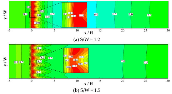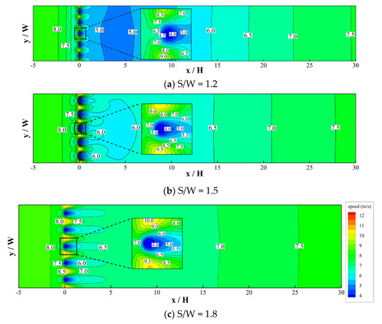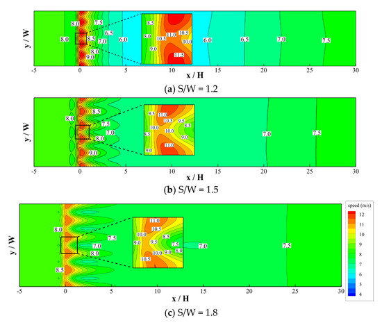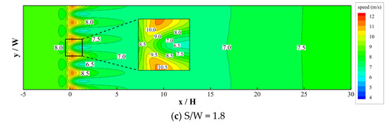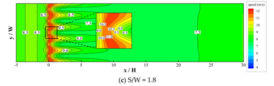 Based on the numerical results, Figure 10, Figure 11, Figure 12 and Figure 13 illustrate the wind speed contours at different tree heights (H) and tree spaces (S) at a ground level of 2 m, corresponding to a common upper limit for pedestrians. Generally, the tendency of wind speed variations at the pedestrian level shows that, as the oncoming flow approaches the trees, it tends to slow down. Lower velocities occur in part of the crowns. In the void spaces between trees, on the other hand, air flow is squeezed and speeds up. As a result, significant spatial deviations in wind speed patterns were found immediately behind the row trees. Further downstream, the extent of the speed deviation along the across-wind direction becomes milder, mainly due to the effect of flow mixing. In addition, wind speed gradually increases at greater downstream distances behind the trees. Figure 8, Figure 9, Figure 10 and Figure 11 also reveal that when tree space (S) or tree height (H) increases, the extent of across-wind velocity deviation becomes more significant and the overall downstream wind speeds tend to increase.