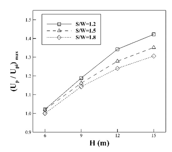 According to the predicted results in Figure 10, Figure 11, Figure 12 and Figure 13, the stream-wise variations of pedestrian-level wind were further analyzed by taking averages along the across-wind direction. Figure 14 illustrates the patterns of the normalized mean stream-wise variations with respect to different tree space ratios (S/W) at different tree heights, where Up and Upi (=8.63 m/s) are the averaged wind speed and the starting wind speed of the oncoming flow, respectively, at a height of 2 m. These variation tendencies essentially quantitatively indicate the downstream shelter effect corresponding to different tree heights and spaces. In all cases, maximum values were found near the locations of the trees. Downstream of the locations of the local speed maxima, the cross-sectional averaged wind speeds decreased significantly until minimum values were reached. Further downstream, the wind speeds tended to recover gradually, far downstream.